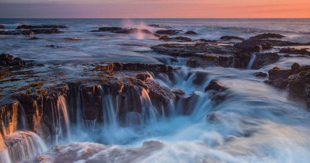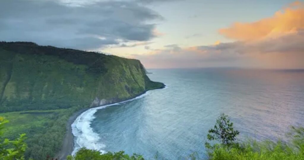 Perched at the edge of the northern coast , Pololū Valley Lookout is one of the most dramatic places to catch a sunset on big island . The steep cliffs drop into lush valleys while the ocean stretches endlessly toward the horizon. As the sun sets , the sky bursts with colors that reflect off the waves, creating a truly unforgettable scene .
